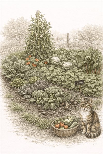 Der Schwerpunkt verschiebt sich jetzt klar. Es geht weniger um erste Vorarbeiten und mehr um das Setzen, Nachsäen, Pflegen und Nutzen freier Flächen. Dazu kommen die ersten regelmäßigen Ernten, die zeigen, dass der Garten vom Aufbau in die Versorgung übergeht.